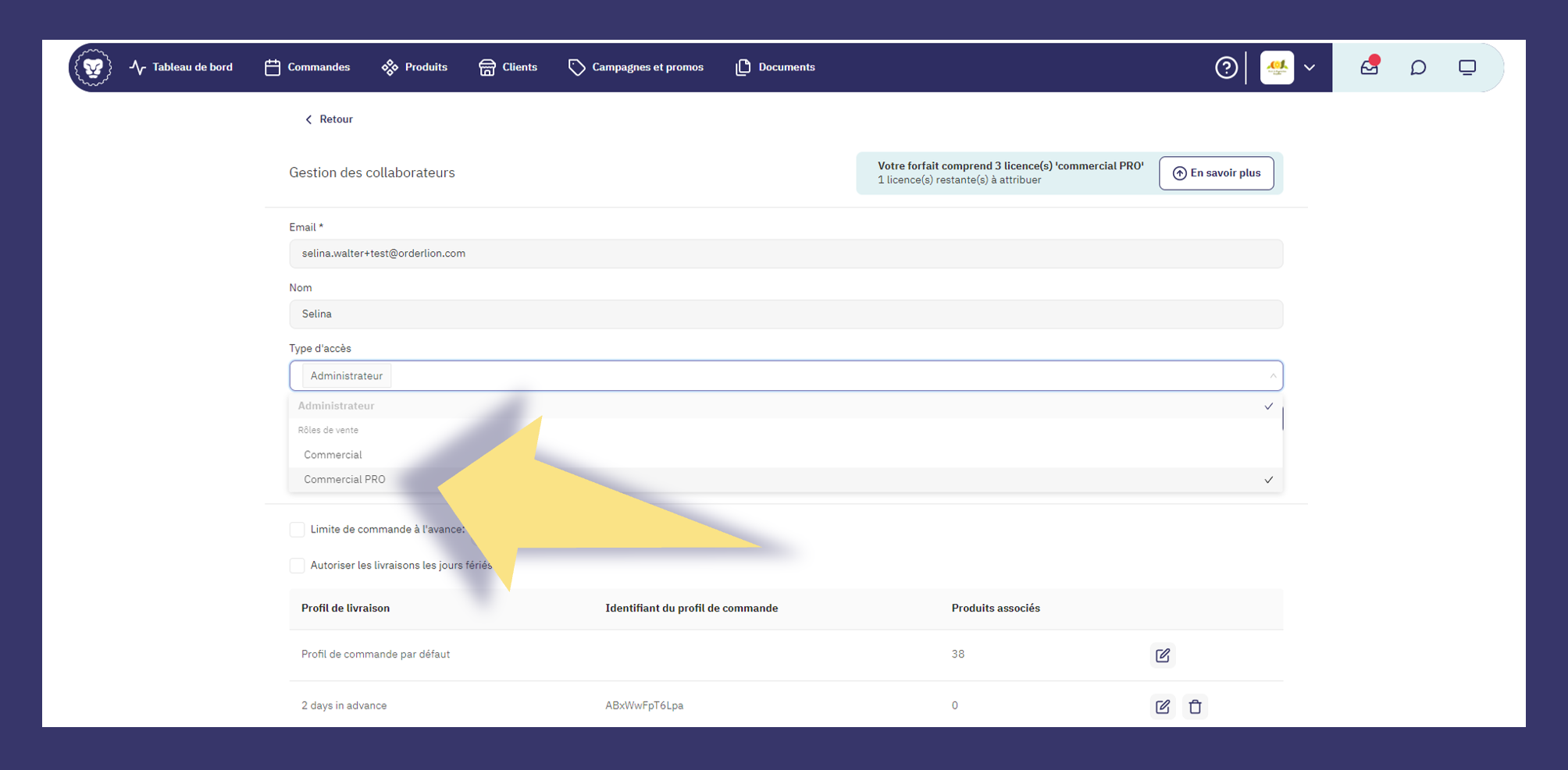 Vous pouvez à tout moment activer les fonctionnalités en attribuant à vos utilisateurs le rôle Commercial PRO dans [les paramètres de la boutique](https://app.orderlion.com/manage/more). Commercial PRO est proposé au tarif de €49 par mois et par utilisateur.
