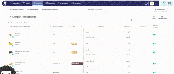 Consultez les noms des produits, les catégories, les labels, les unités de commande, les prix et les détails EAN/GTIN.