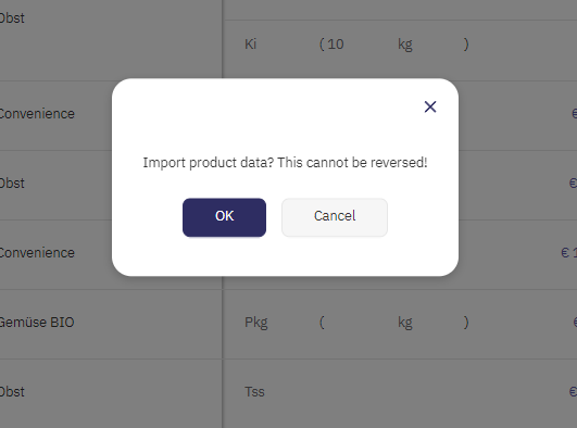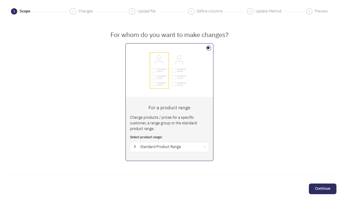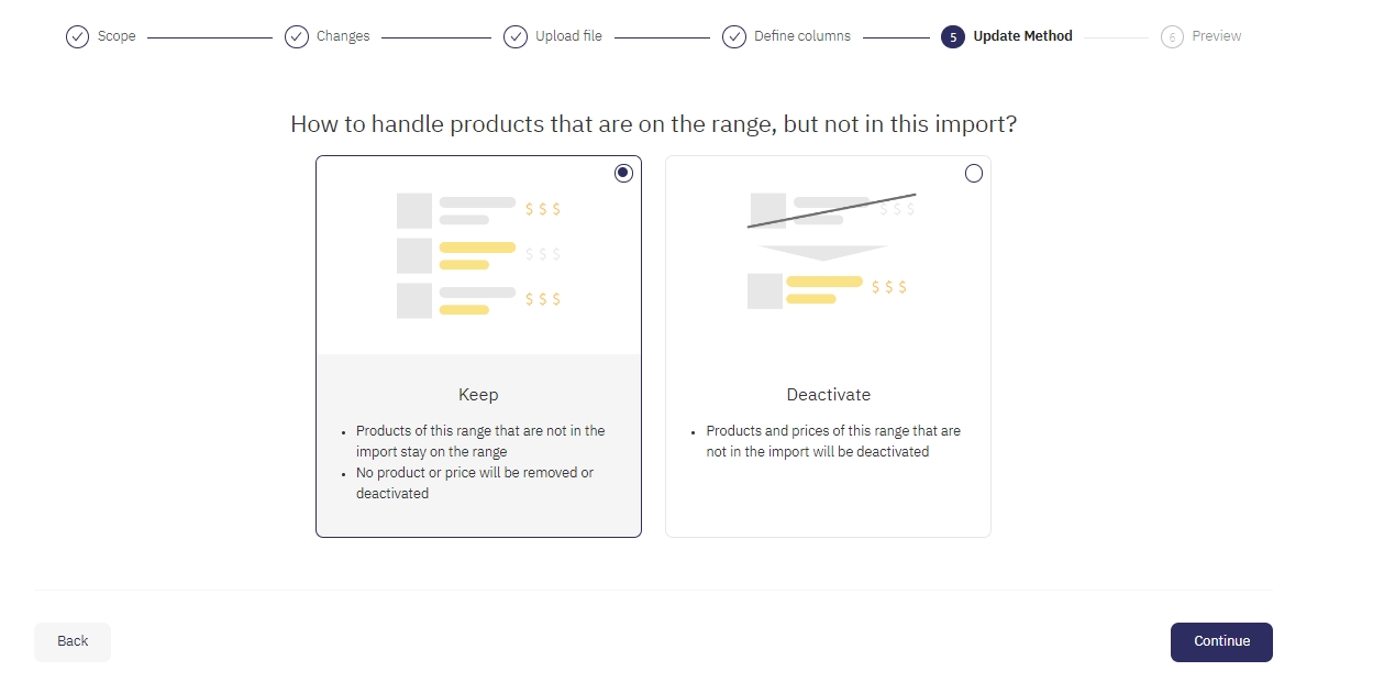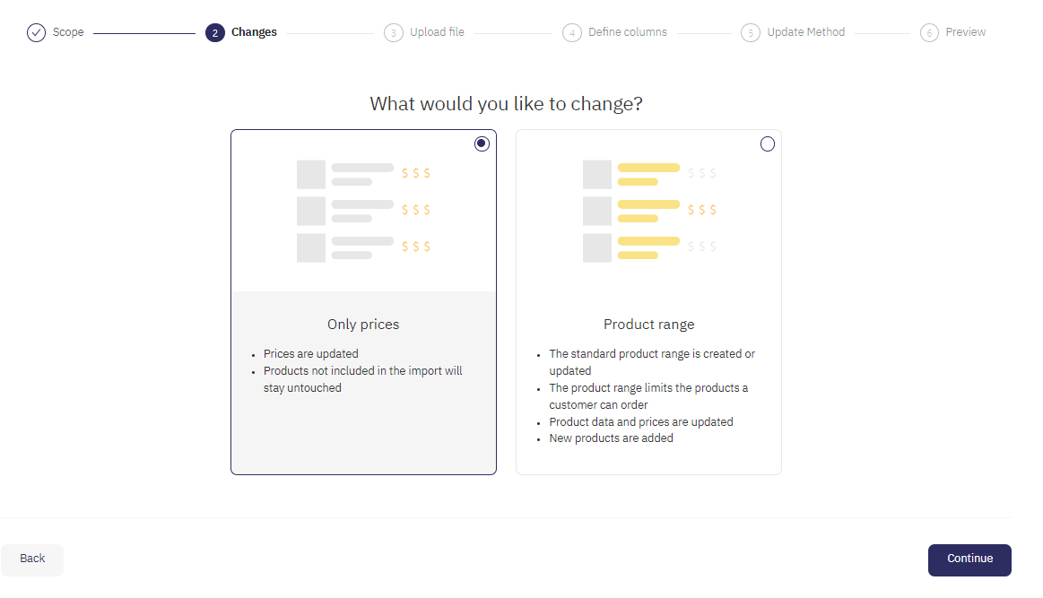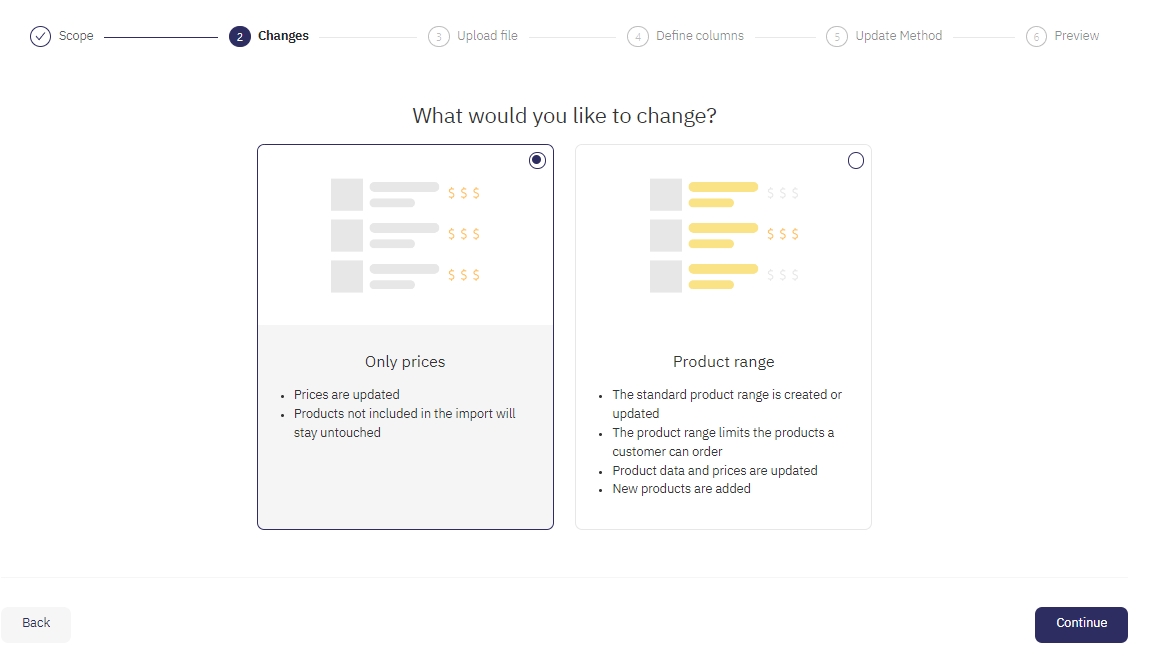 Decidere se si vuole creare o modificare un assortimento o solo aggiornare i prezzi. Per le modifiche dei prezzi, i prodotti che non fanno parte dell'importazione rimangono inalterati. Per le modifiche all'assortimento, viene aggiornato l'assortimento standard, limitando i prodotti che un cliente può ordinare, e vengono aggiunti nuovi prodotti.