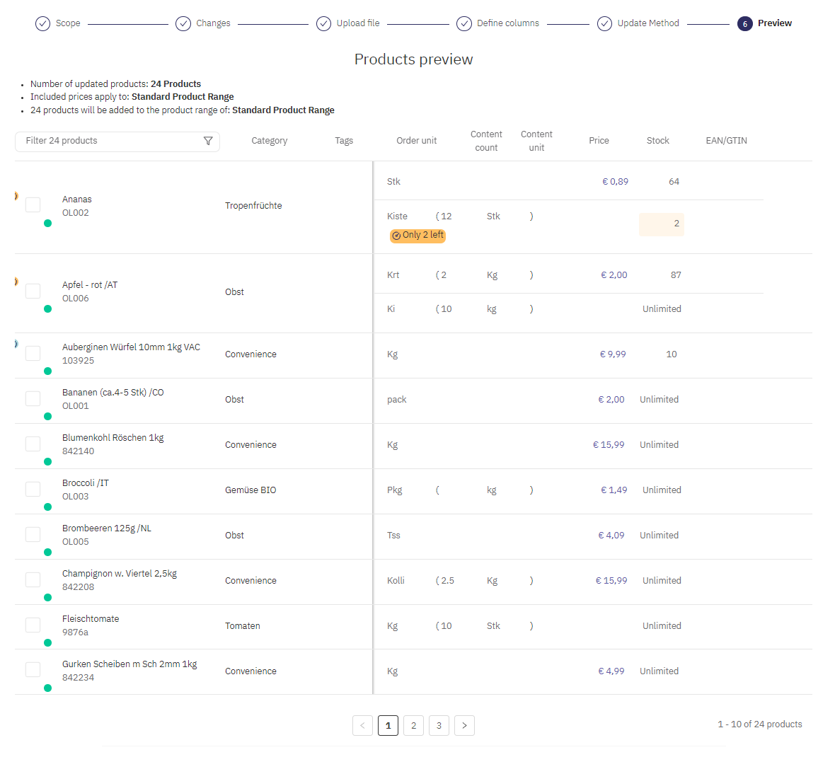 Controllare l'anteprima dell'assortimento nel webshop. Premete "Leggi i file" per completare l'importazione.