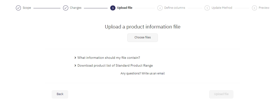 Caricare un file con le informazioni sui prodotti. È inoltre possibile trovare un file Excel come modello da modificare alla voce "Scarica l'elenco dei prodotti della gamma di prodotti standard".