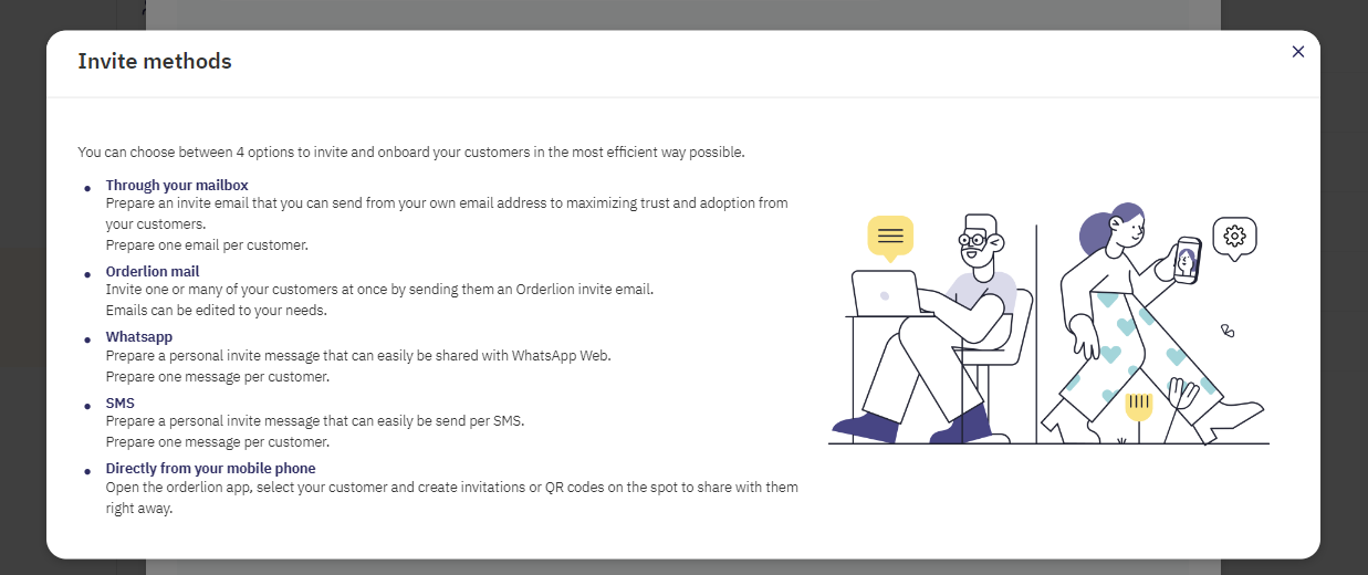* **Invito massivo a tutti i clienti tramite e-mail o SMS di Orderlion:** Un messaggio pre-scritto può essere inviato a tutti senza modifiche preliminari. Questi messaggi possono essere modificati nell'anteprima. (Vedere inviti tramite il portale).